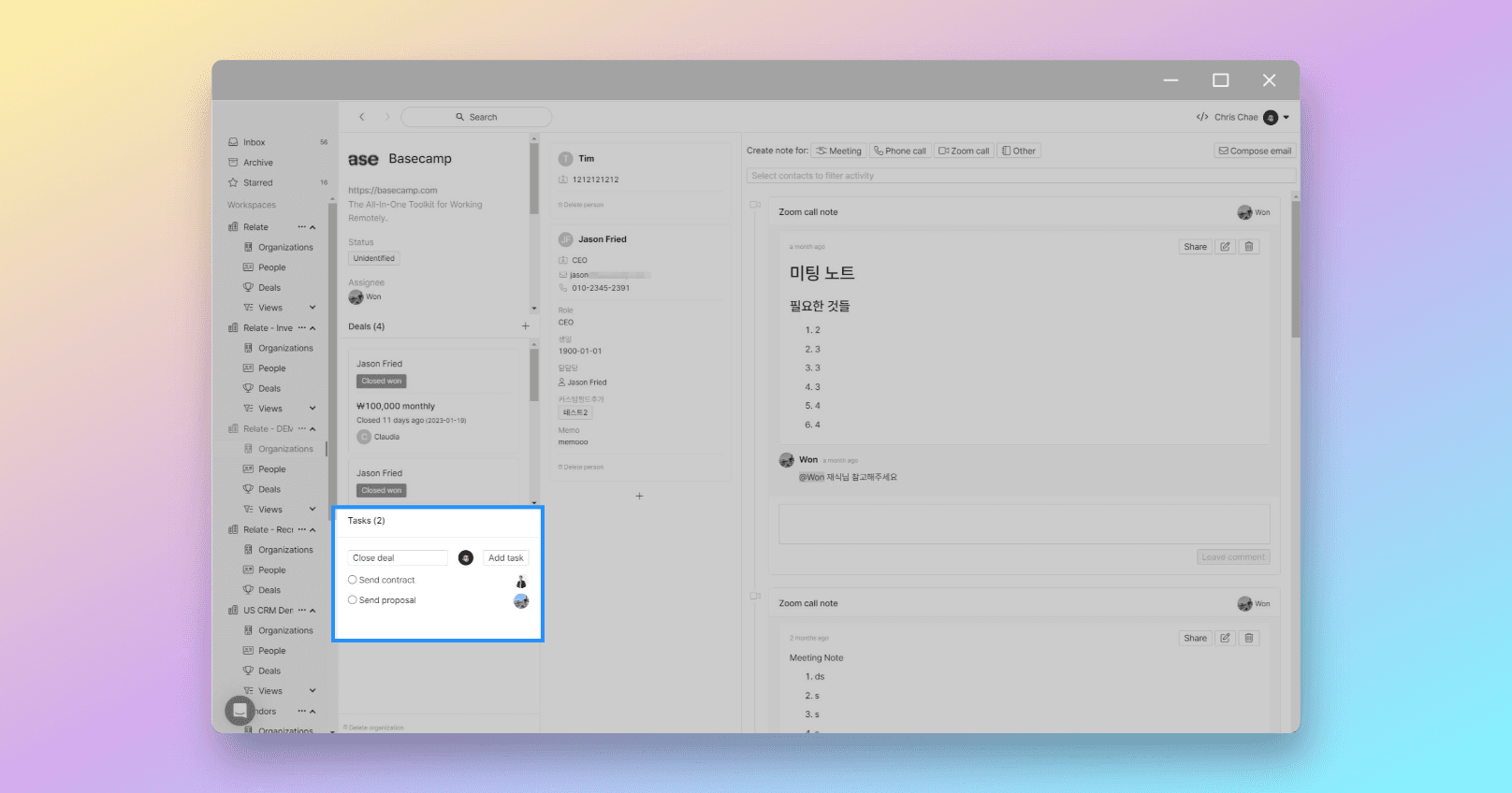 Relate의 Task v1.0은 Organization Detail Page (각 고객사 페이지)에서 관리합니다. 위 스크린샷에서 보이는 것처럼, 왼쪽 하단에서 Task 리스트를 확인하고 관리할 수 있습니다.