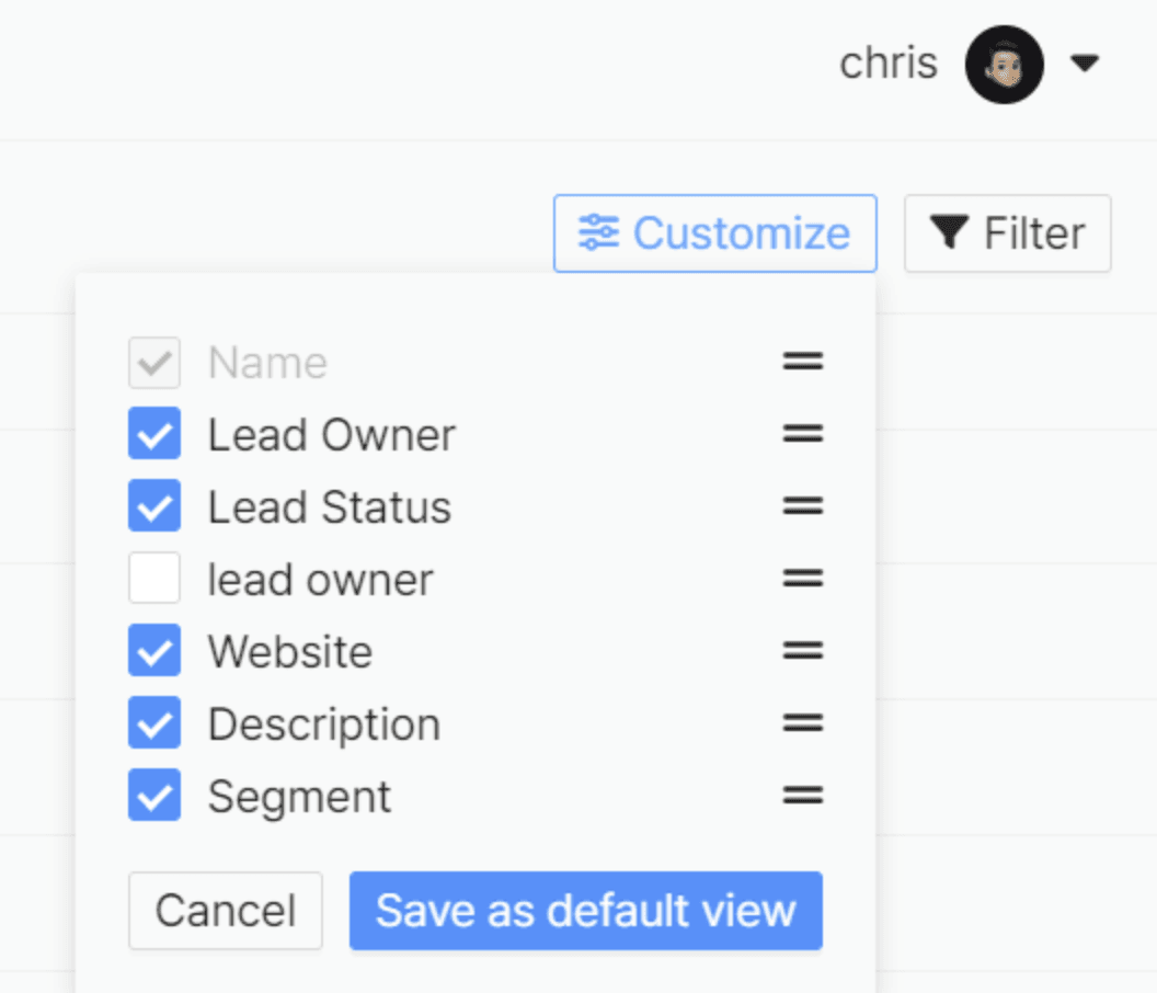 Lead/Contact 리스트에서 칼럼의 순서를 수정하실 수 있고, 보지 않아도 되는 필드를 숨김처리하신 다음, Default View 로 저장하실 수 있습니다.