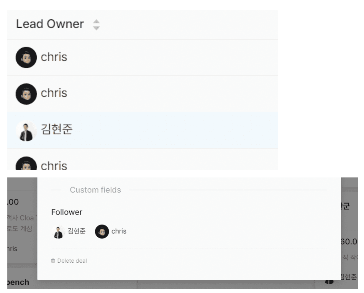 Deal Pipeline에서 1명 이상이 해당 Deal을 모니터 및 담당해야 할 경우, “follower” 등의 field를 만들어 관리할 수 있습니다.