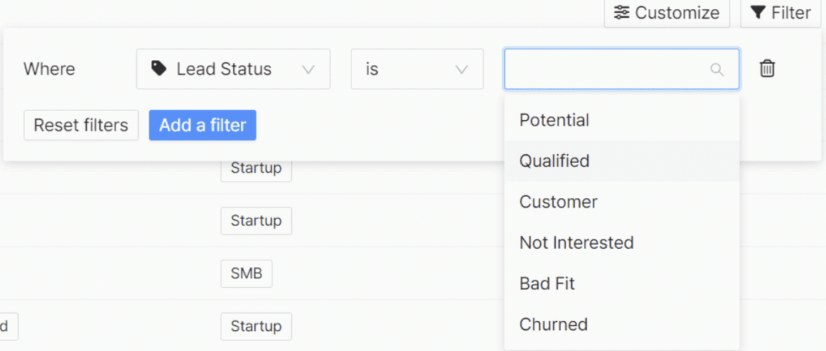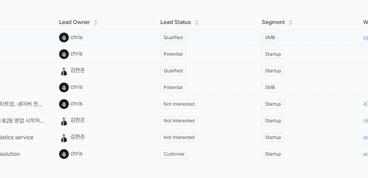 Single/multi-selection 을 통해서 각 Lead에 Status를 부여해서 Deal Pipeline과 별개의 Status를 관리할 수 있습니다.