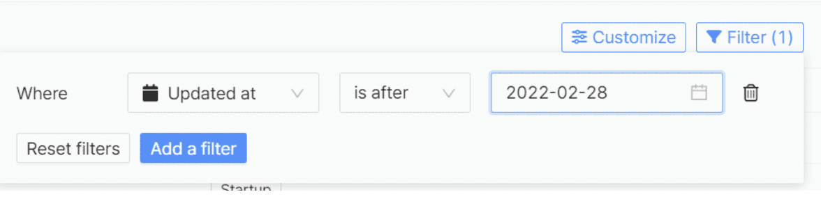 이제 각 Custom Field들도 지정값에 맞게 Filter 하실 수 있고, 마지막 Update 된 일시를 is after로 구분해서 (예를 들면) 이번 주 새로 업데이트 된 Lead 를 filter 해서 보실 수 있습니다. (아래 스크린샷 참고)