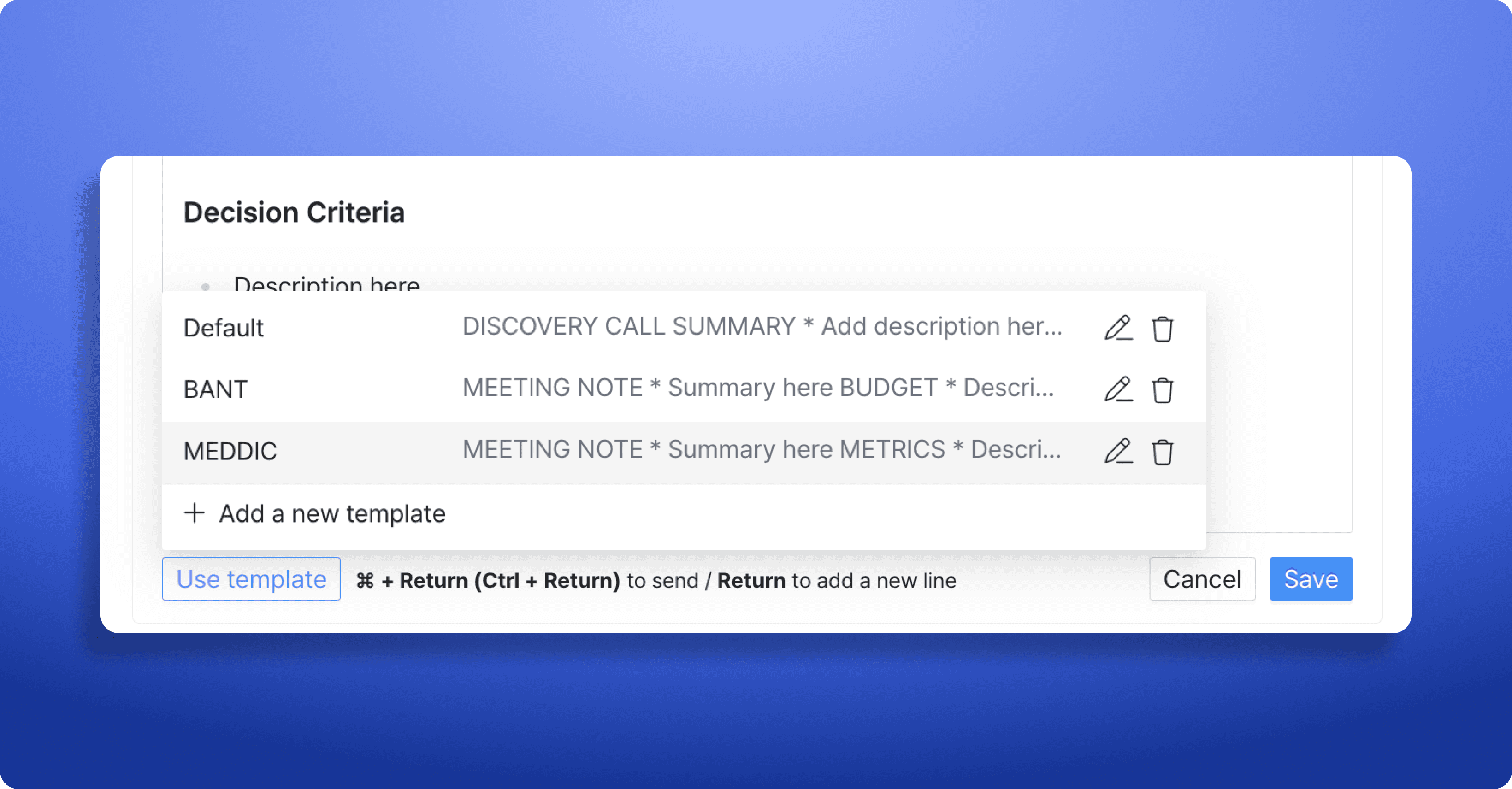 노트 템플릿을 만들고 활용하여 BANT, MEDDIC과 같이 널리 사용되는 영업 노트 프레임워크를 쉽고 빠르게 불러서 작성할 수 있습니다.
