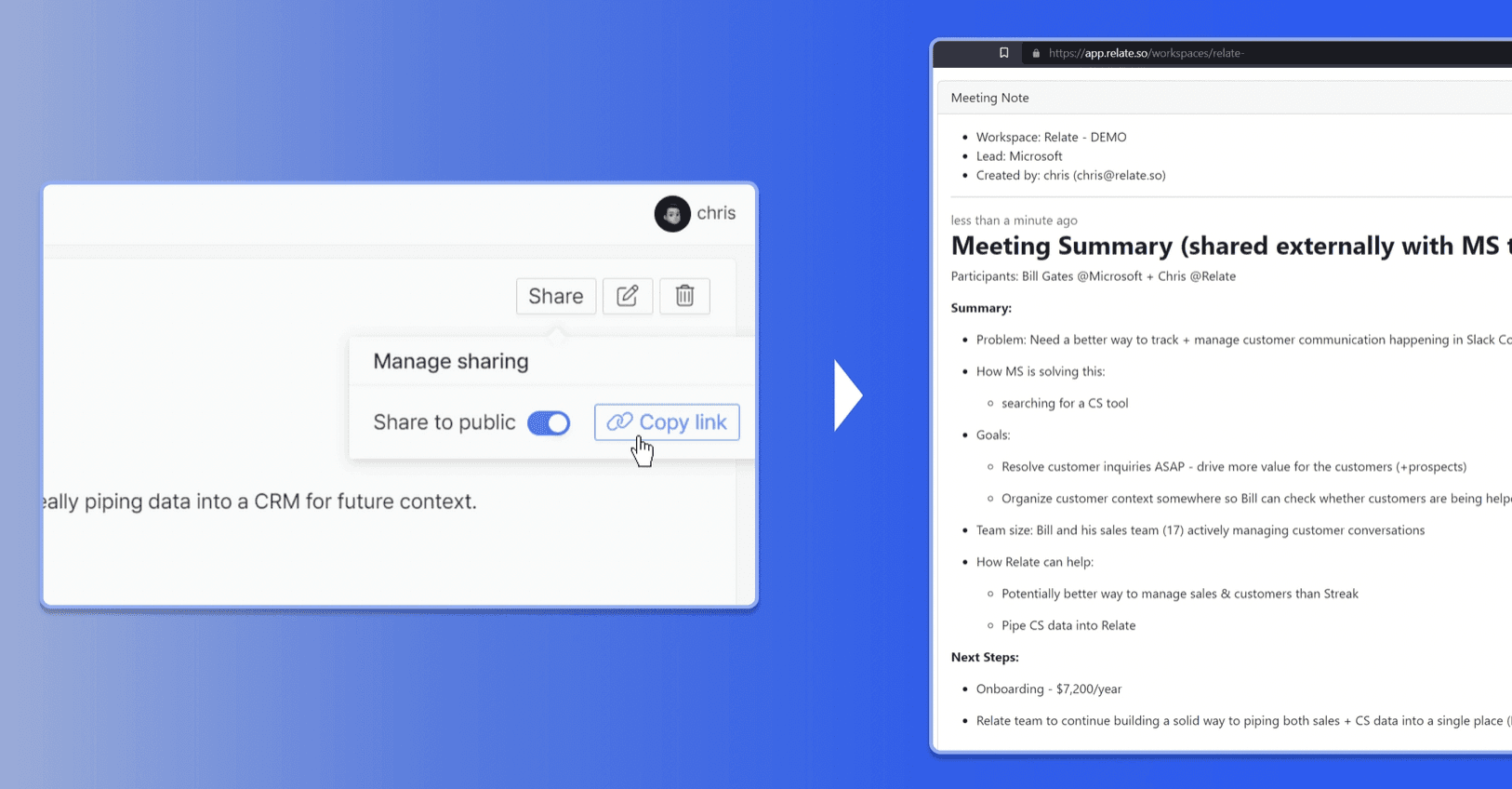 좋은 use case 중 하나는 제품 팀에게 세일즈 현황이나 고객과의 미팅을 공유할 때입니다. 현황 및 미팅 노트를 슬랙을 공유할 때 복사 붙혀넣기 하는 것보다 링크 한 줄로 손쉽게 공유해보세요.(이것도 Zapier를 통해 자동으로 Relate -> Slack으로 공유 가능합니다).