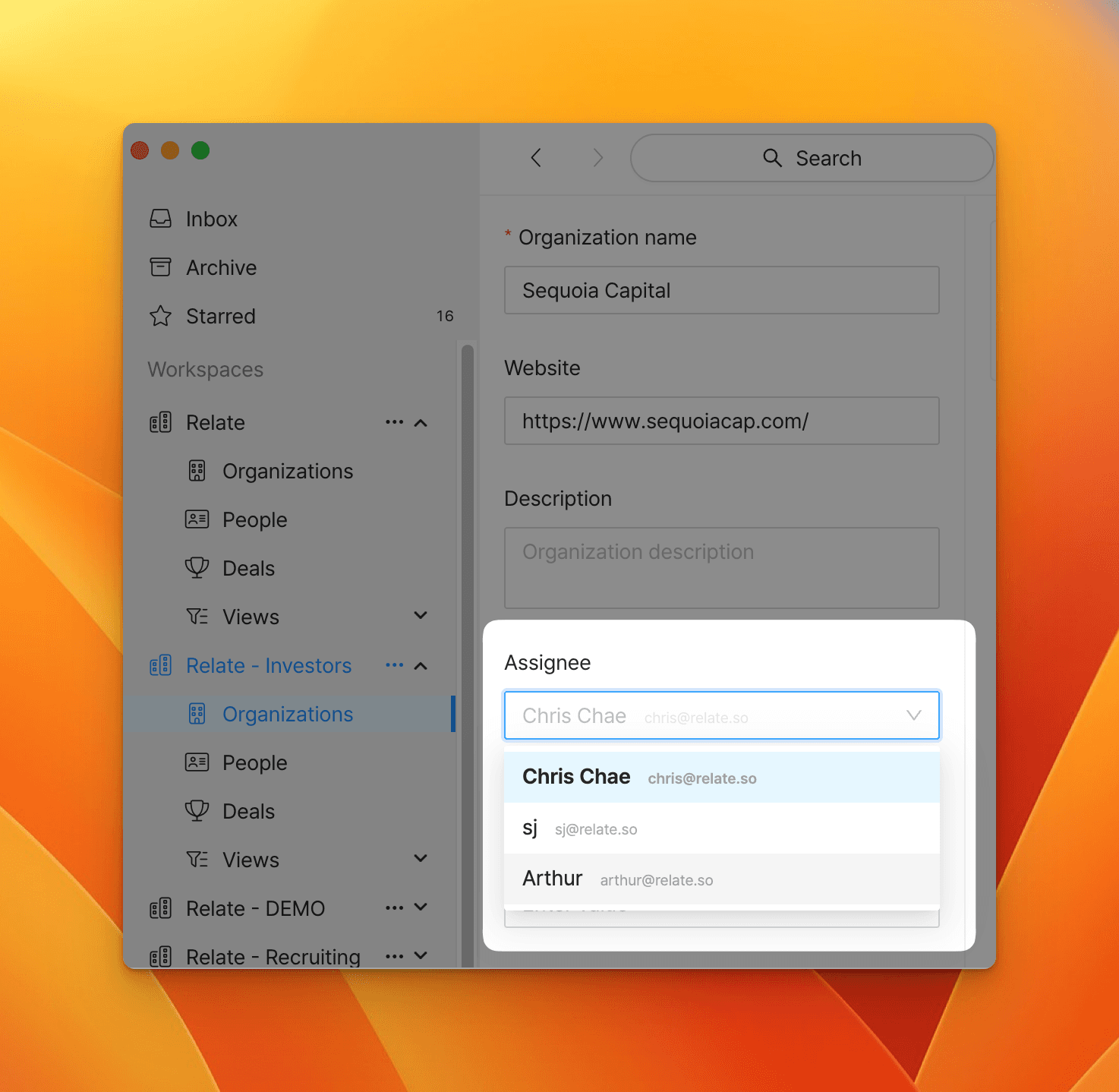 팀원을 Organization 담당자로 지정하기 위해서는 Organization 디테일 페이지에 들어가서 Assignee 필드를 수정하면 됩니다.