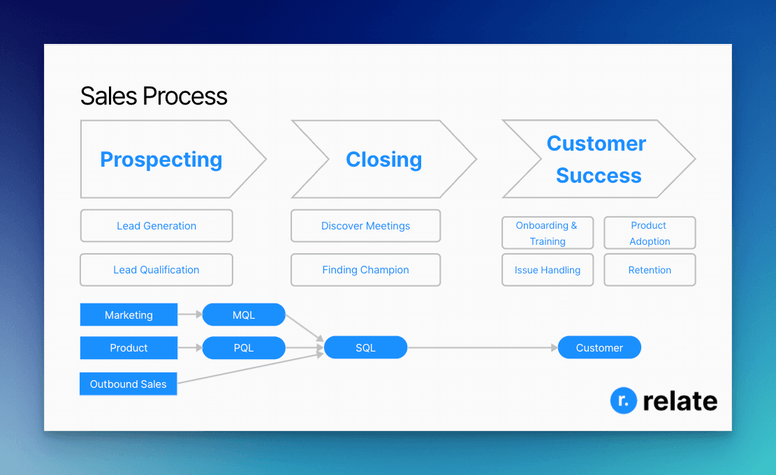 Relate의 Organization Status 기능은 기업의 세일즈 프로세스를 end-to-end (유입부터 고객성공까지)관리할 수 있도록 고안된 기능입니다. 아래는 Relate에서 적용하는 세일즈 프로세스 베스트 프랙티스입니다.