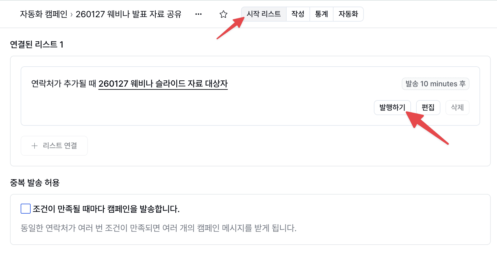 자동화 캠페인에서 공유 링크를 생성하는 경우: 각 자동화 캠페인의 상세 페이지 > ‘시작리스트’ 탭 > ‘발행하기’ 클릭