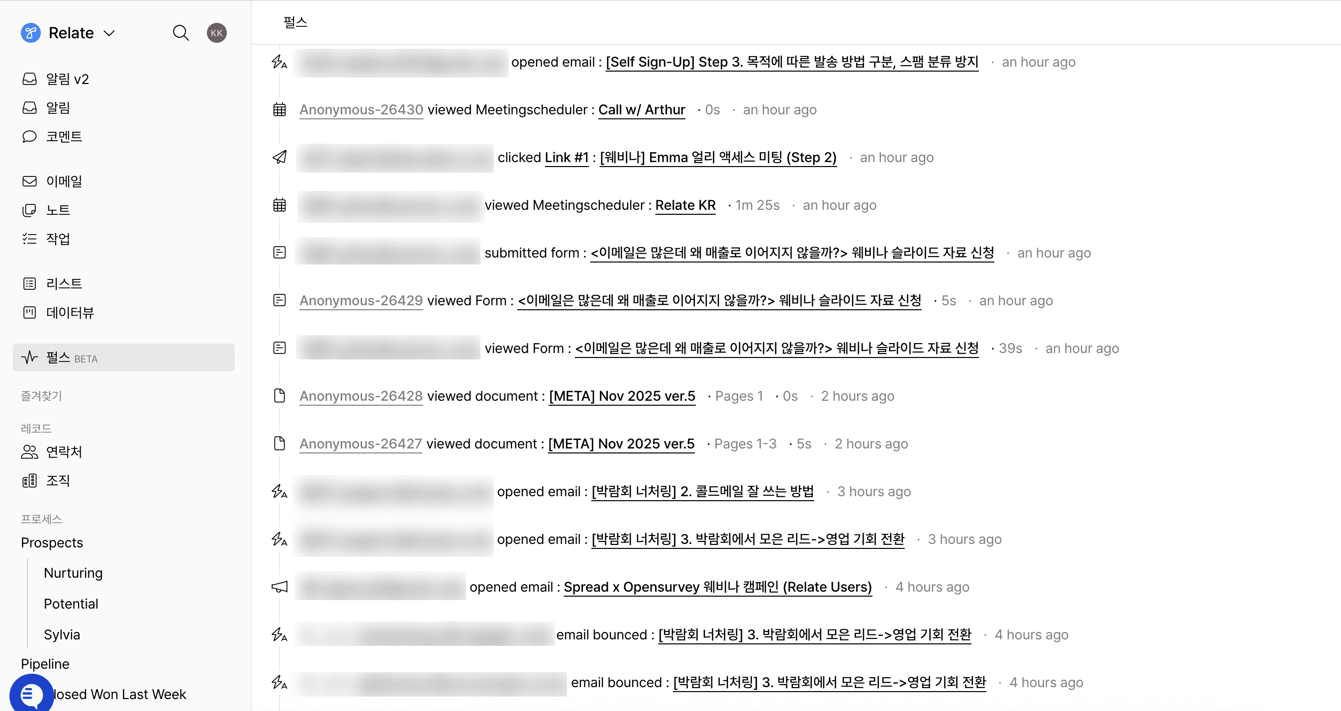 Pulse는 이메일 열람부터 문서 조회, 폼 제출, 미팅 예약, 웹페이지 방문까지 리드의 모든 행동을 하나의 타임라인으로 수집해 보여주는 기능입니다. 단순한 지표를 넘어, 리드가 어떤 콘텐츠에 관심을 보였고 어떤 경로로 전환되었는지 한 화면에서 확인할 수 있습니다.