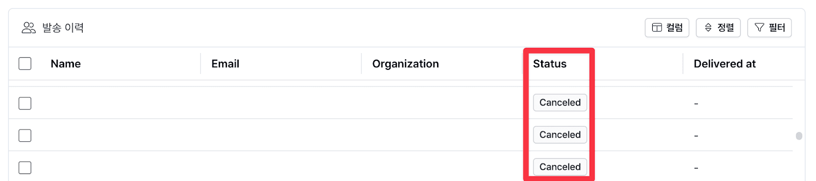 이 경우, 해당 연락처의 발송 상태(Status)는 Canceled로 표시되며, 대표적인 예시는 다음과 같습니다:
