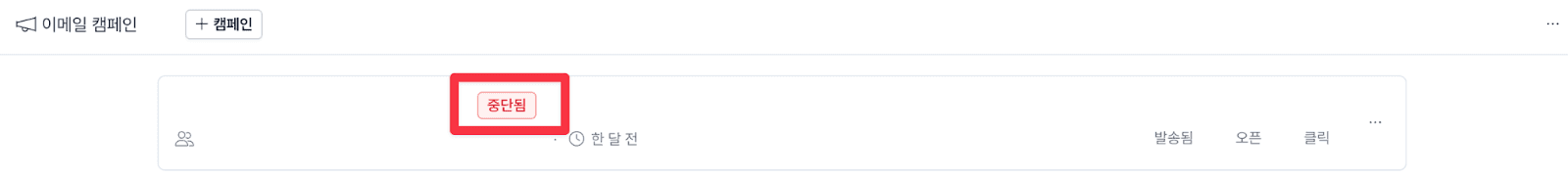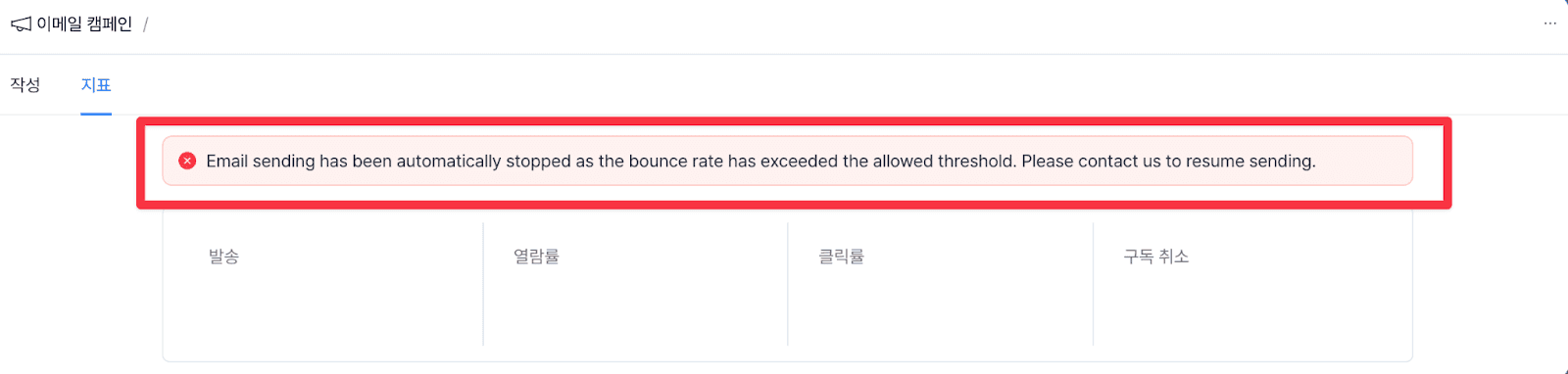 발송 중단 사유는 해당 캠페인 > 지표 화면에서 붉은색 경고 메시지로 확인할 수 있습니다.