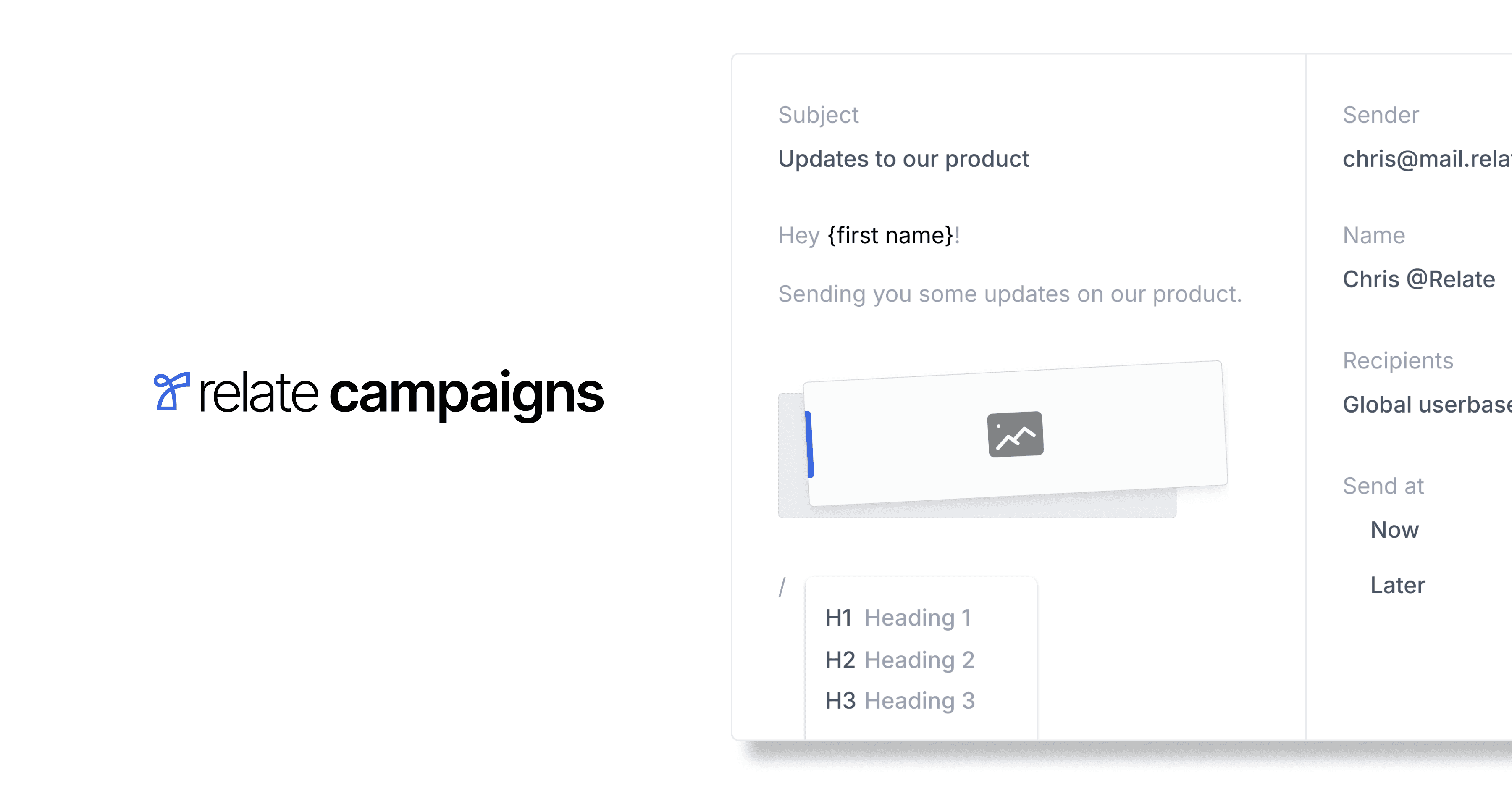 Relate 캠페인(Campaigns)은 B2B 마케팅 팀을 위한 심플한 이메일 마케팅 툴입니다. 캠페인을 활용해서 잠재 고객과 고객에게 마케팅 이메일을 보내거나, 회사 소식을 공유할 수 있습니다.