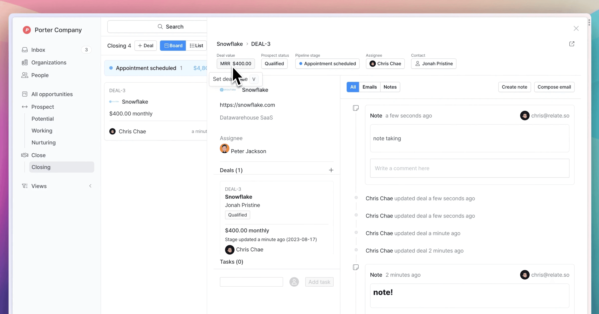 이곳에서 바로 Deal에 대한 업데이트 사항을 노트로 남기거나, 이전 노트/이메일 히스토리를 확인할 수 있습니다.