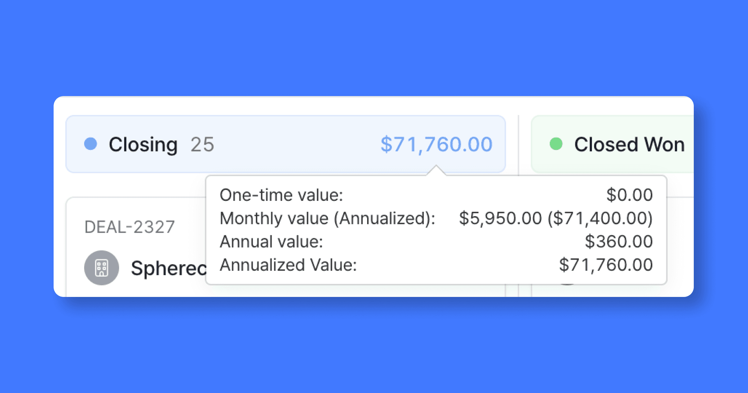 이전에는 파이프라인 스테이지의 Value를 보여주는 방식이 다소 복잡한 면이 있었습니다. 이제 One-time, MRR, ARR을 Annualized (1년에 책정할 수 있는 매출액) value로 환산하여 합쳐진(aggregated) 금액을 표시합니다.