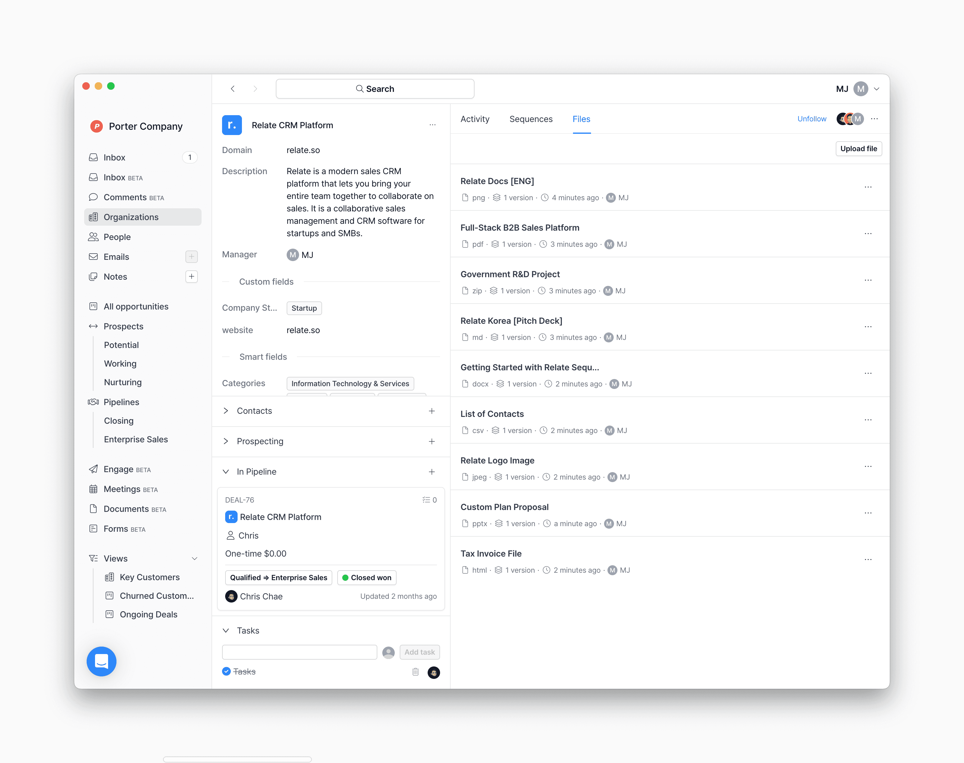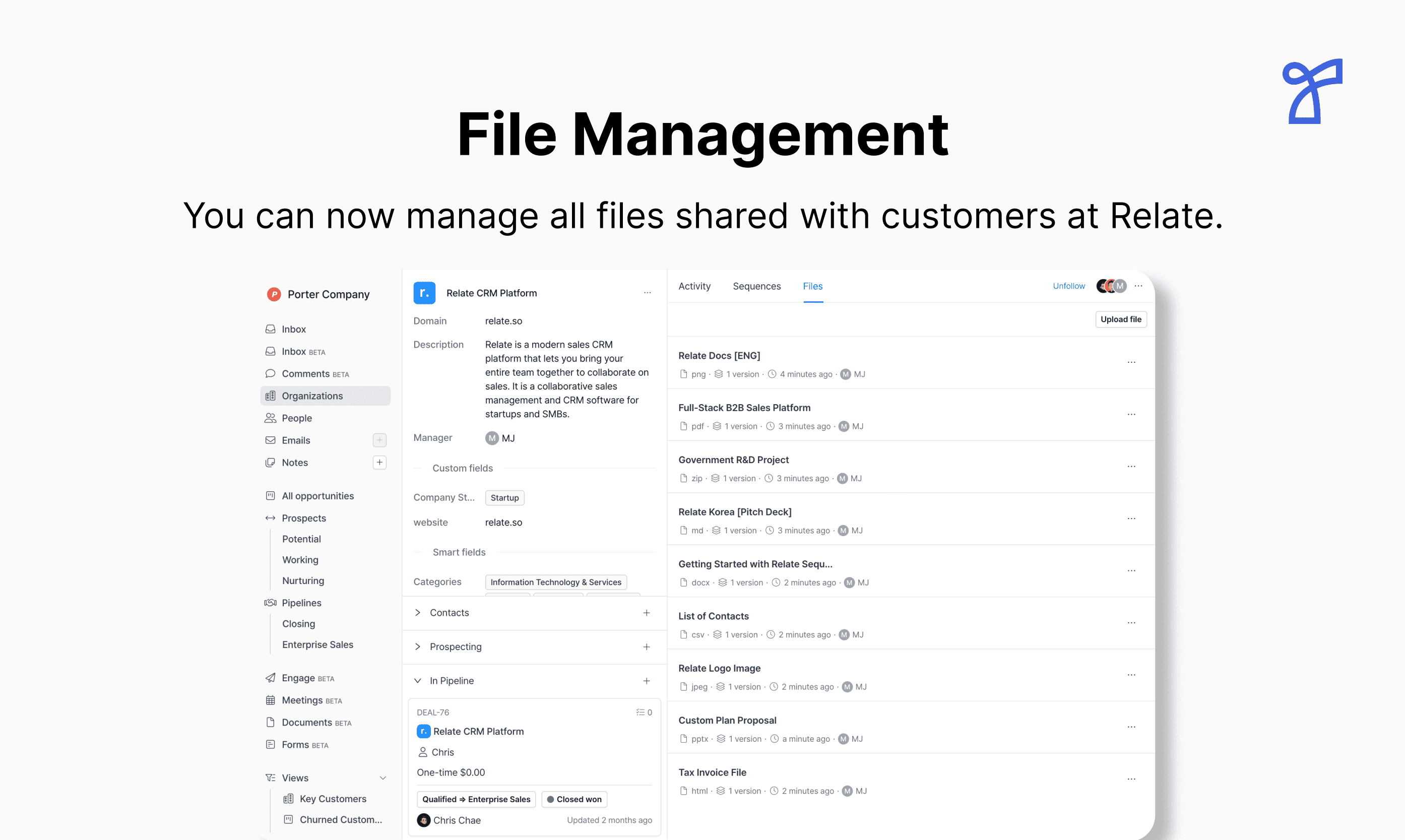 이제 Relate에서 File Management 기능을 통해 Organization 별로 주고받은 모든 파일을 편리하게 관리할 수 있습니다.