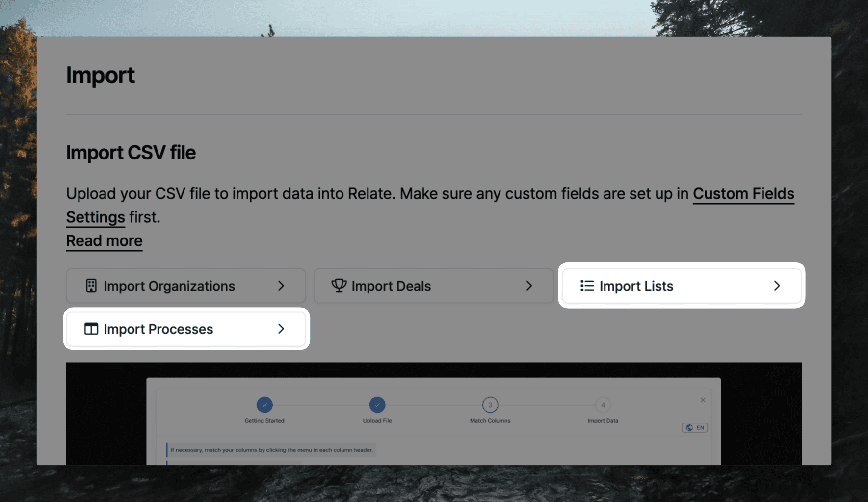 화면에 제시된 예시와 같은 형식으로 csv 파일을 준비하여 업로드합니다. 이때, 임포트할 필드가 Relate에 존재하지 않는다면, custom fields를 먼저 등록해야 합니다. (커스텀 필드 안내 및 설정 방법은 이 문서를 참고해주세요.)