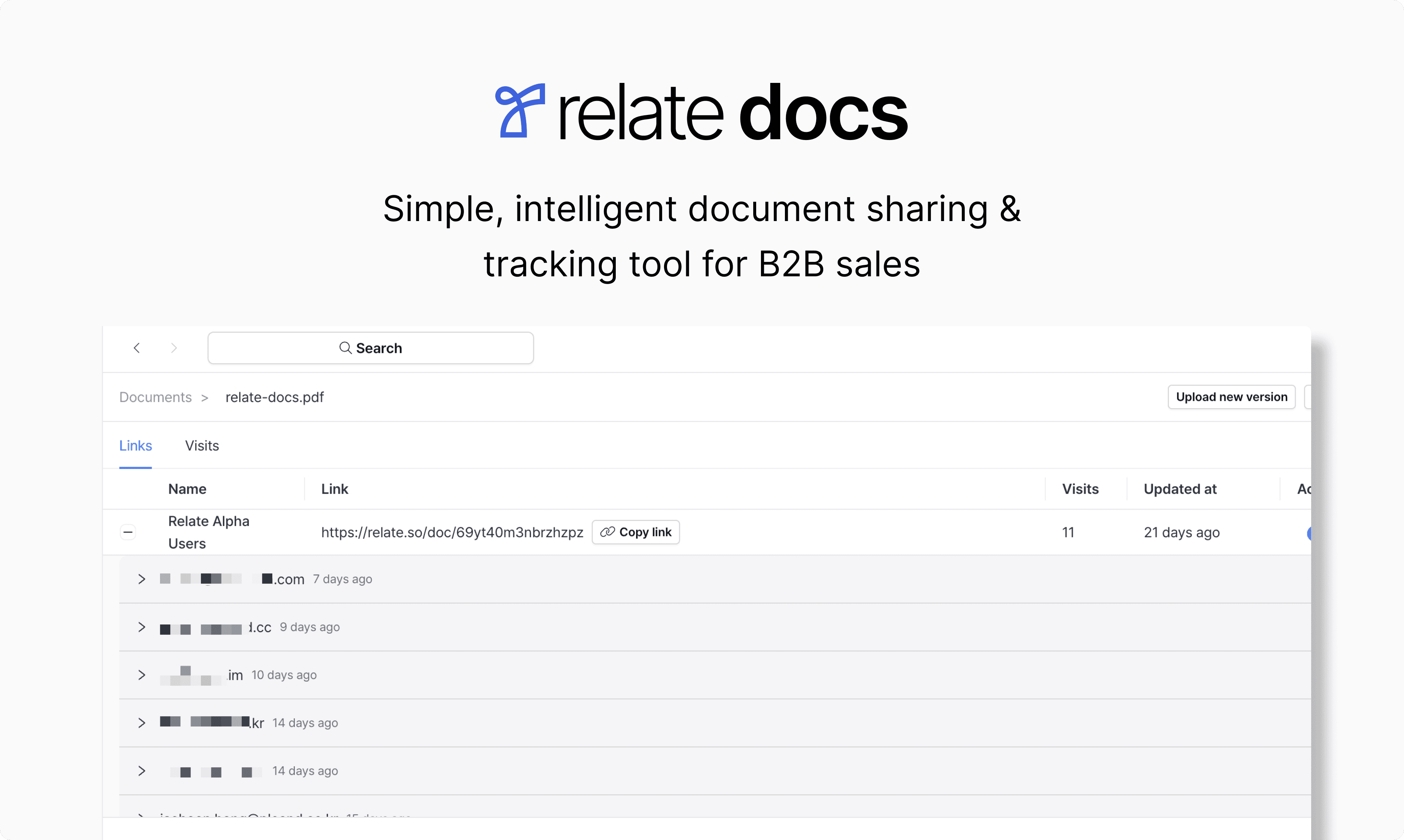 Relate Docs는 문서를 링크로 공유하여 상대방의 열람 여부를 추적하고, 문서 비밀번호 설정, 이메일 캡처, 다운로드 설정, 문서 버전관리 등의 유용한 문서 제어 기능을 제공합니다.