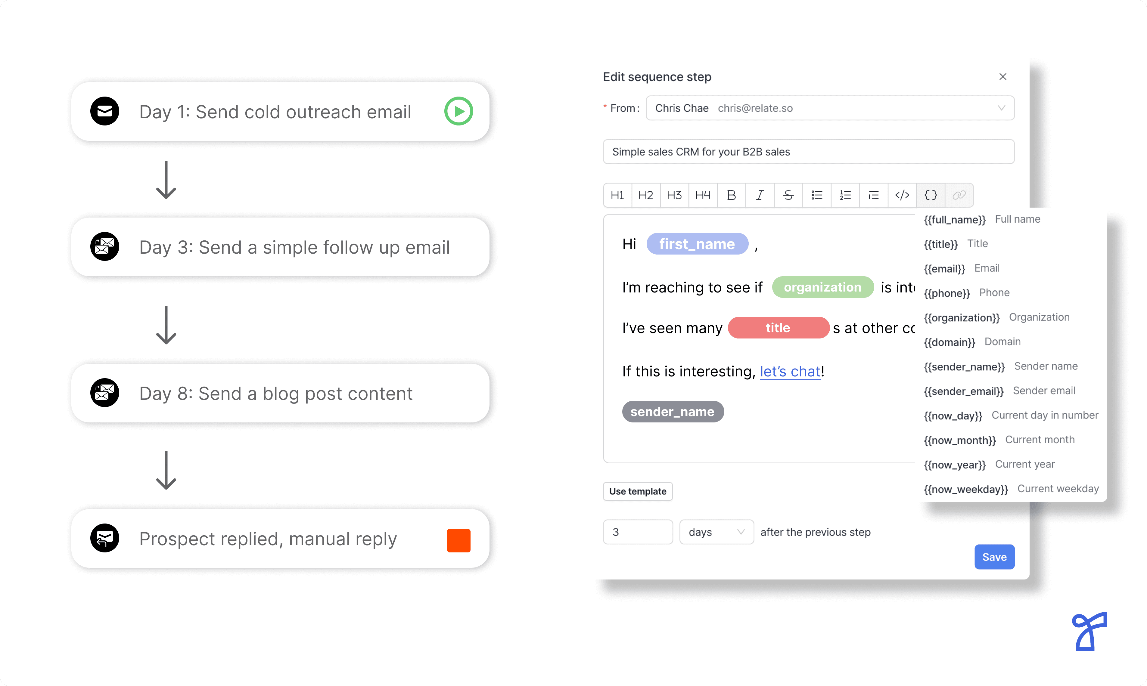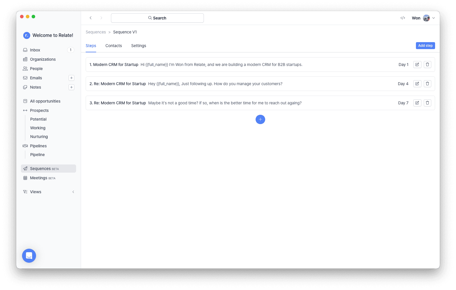 이제 Relate Sequence를 사용하여 여러 일에 걸친 이메일을 자동으로 보낼 수 있습니다. Relate Sequence 베타는 B2B 스타트업을 위해 만들어진 간단한 이메일 자동화 툴로, 현재 모든 Relate 유료 플랜을 사용하는 사용자들에게 제공됩니다.