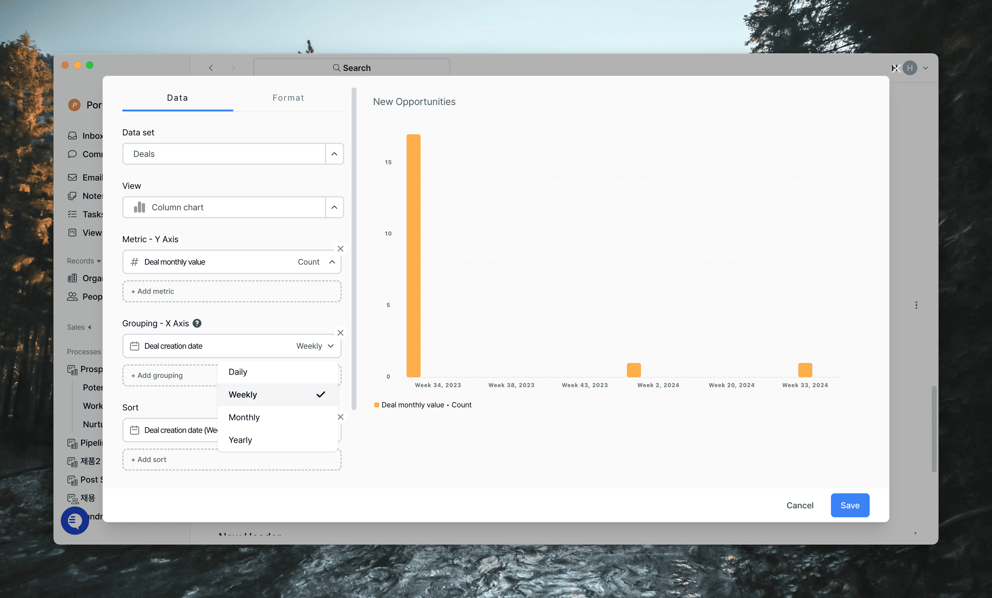주간별로 데이터를 확인할 수 있도록 리포팅 페이지에서 column chart 기준 x axis에 weekly 옵션이 추가되었습니다.