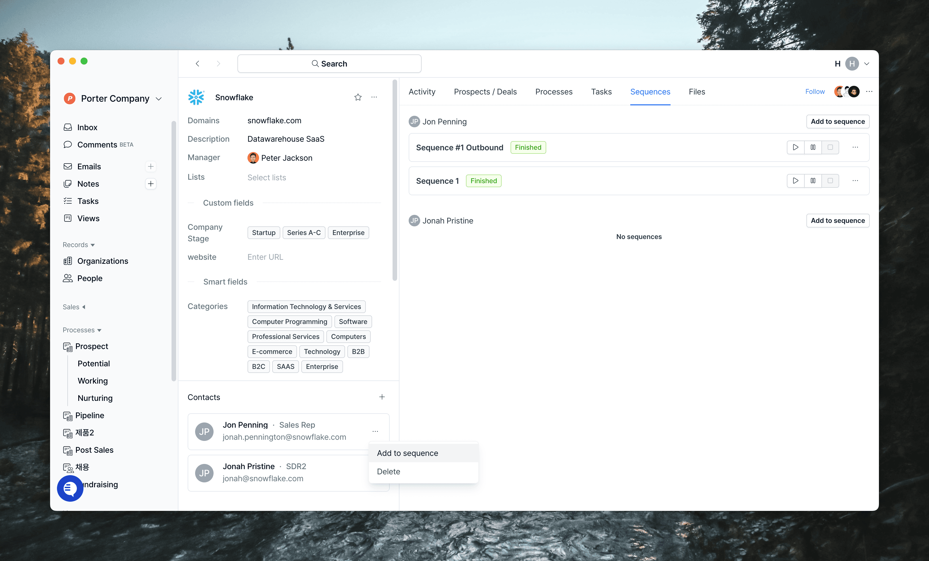 개별 contact에서 'Add to sequence'를 통해 sequence를 추가할 수 있습니다.