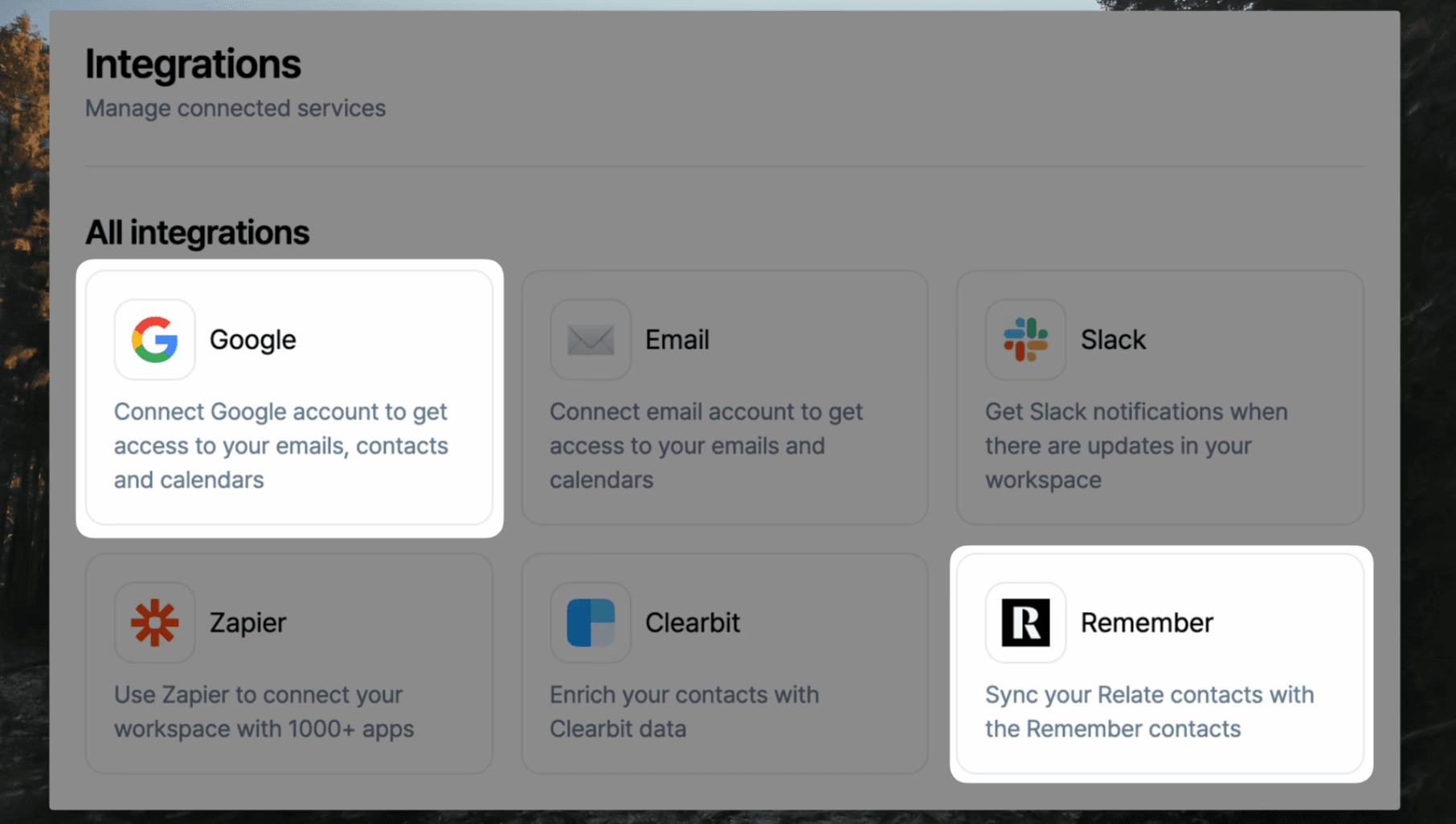 이제 개인 워크스페이스에서 구글 주소록 (Google Contacts)와 리멤버(Remember)의 연락처를 연동할 수 있습니다. 이를 통해 보다 간편하게 개인 연락처를 Relate에 연결해 관리할 수 있습니다.