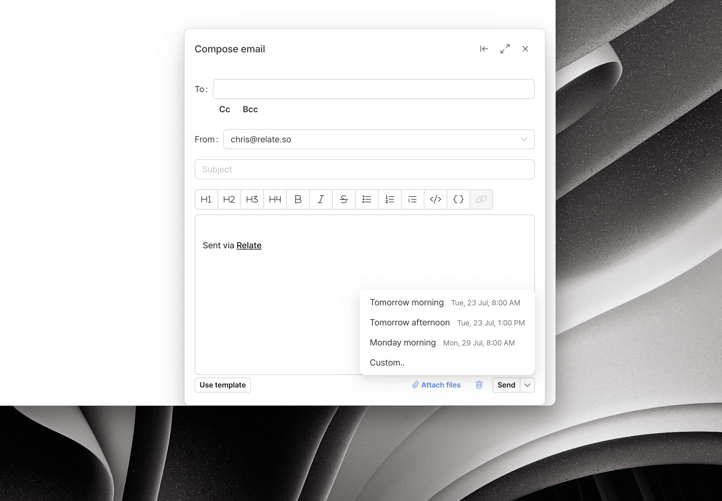 가장 많이 쓰이는 예약 일정인 Tomorrow morning, Tomorrow afternoon, Monday morning 등 외에도 특정 시간과 날짜에 보낼 수 있도록 커스터마이제이션이 가능합니다.