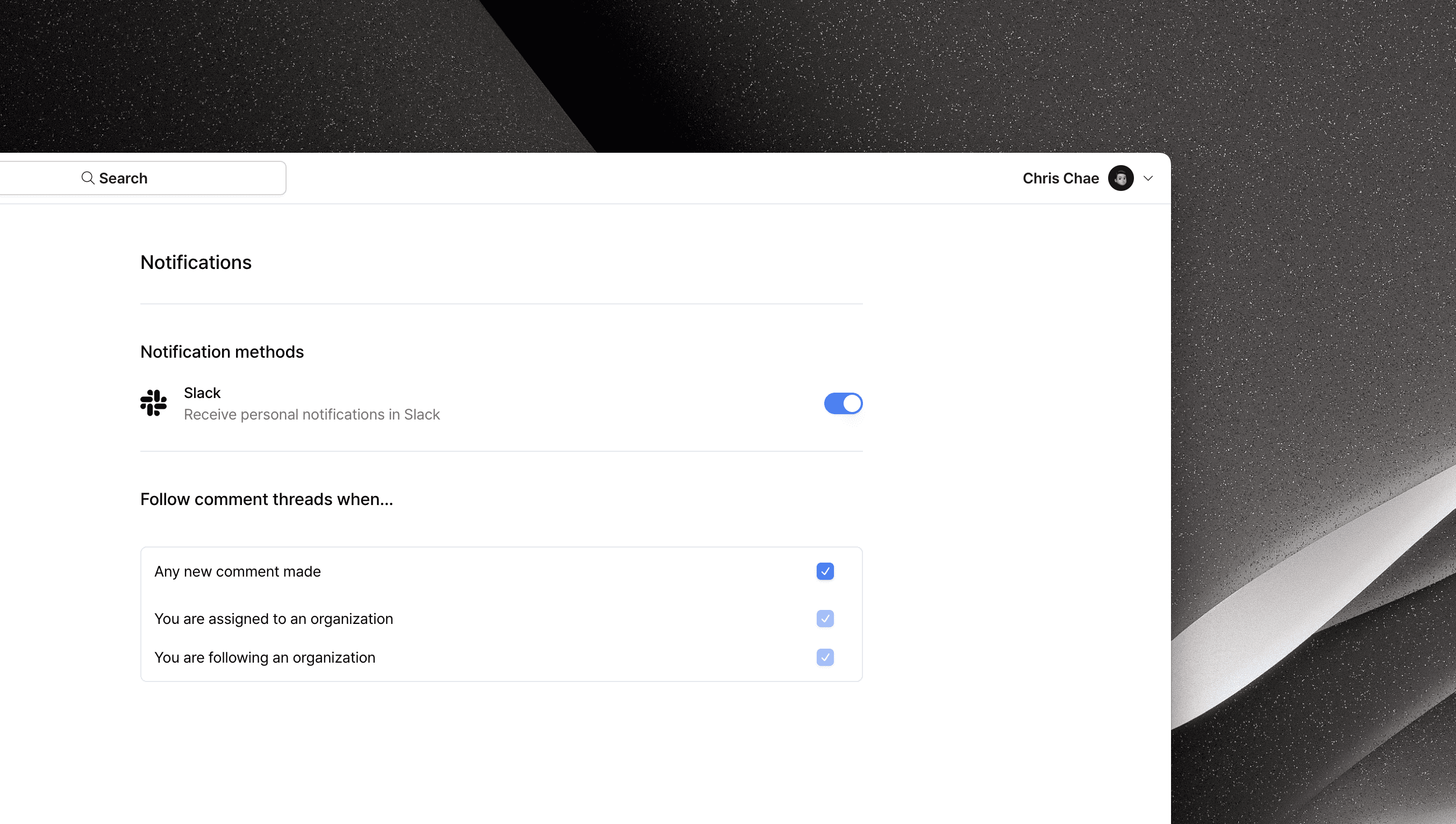 워크스페이스 세팅 페이지 (앱에서 워크스페이스 이름 누르고 Settings로 이동)에서 Workspace 섹션 밑에 있는 Team notifications와 Account 섹션 밑에 있는 Notifications에서 연동 및 설정 커스터마이제이션이 가능합니다.