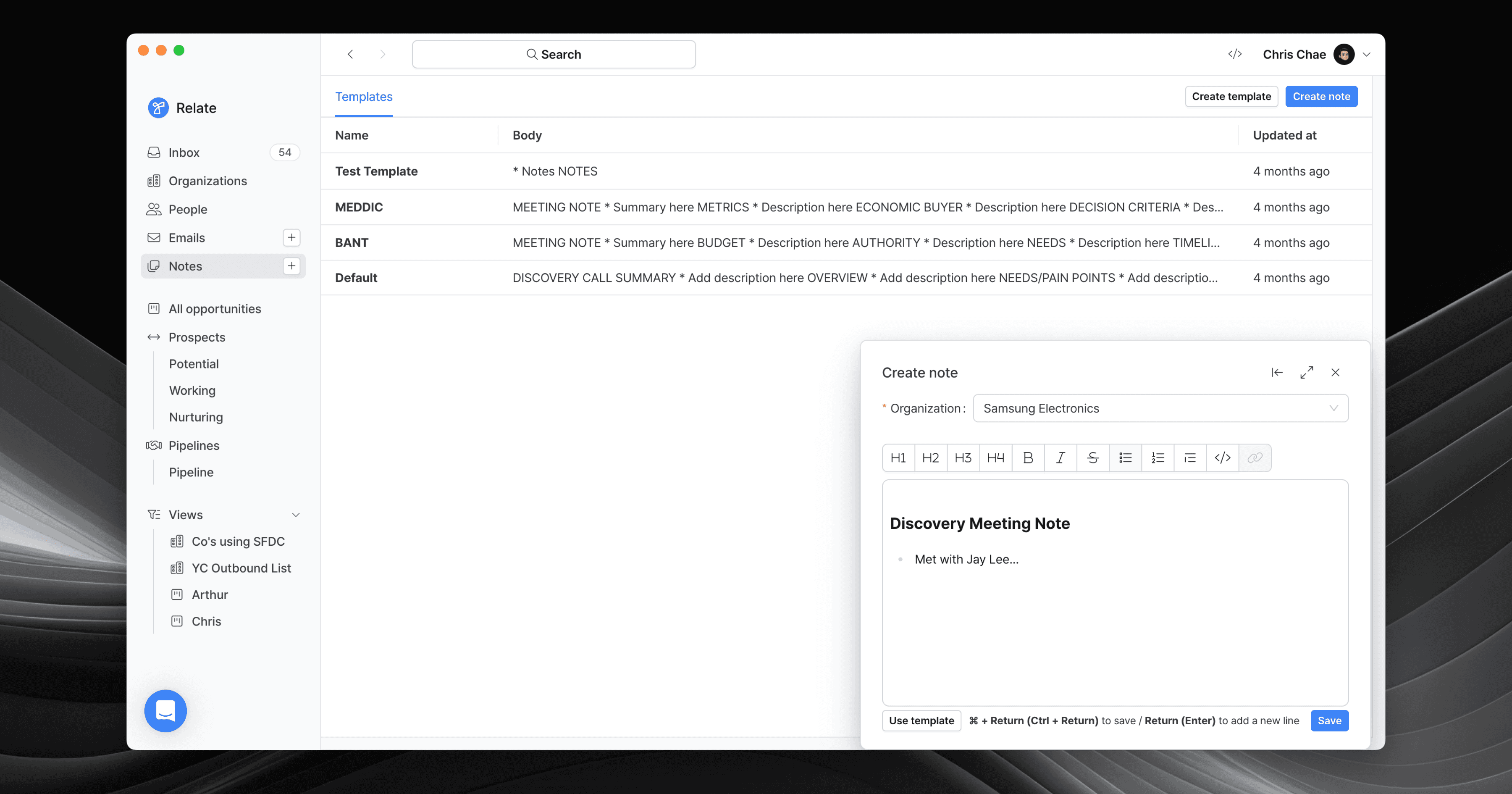 이제 Relate 어디에서나 노트 작성을 할 수 있습니다. 새로운 노트를 작성하려면 왼쪽 메뉴에서 Note로 이동합니다. 그런 다음 +를 클릭하여 새로운 노트를 작성합니다. 여전히 고객 상세 페이지 (Organization Detail Page)에서도 노트를 작성할 수 있습니다.