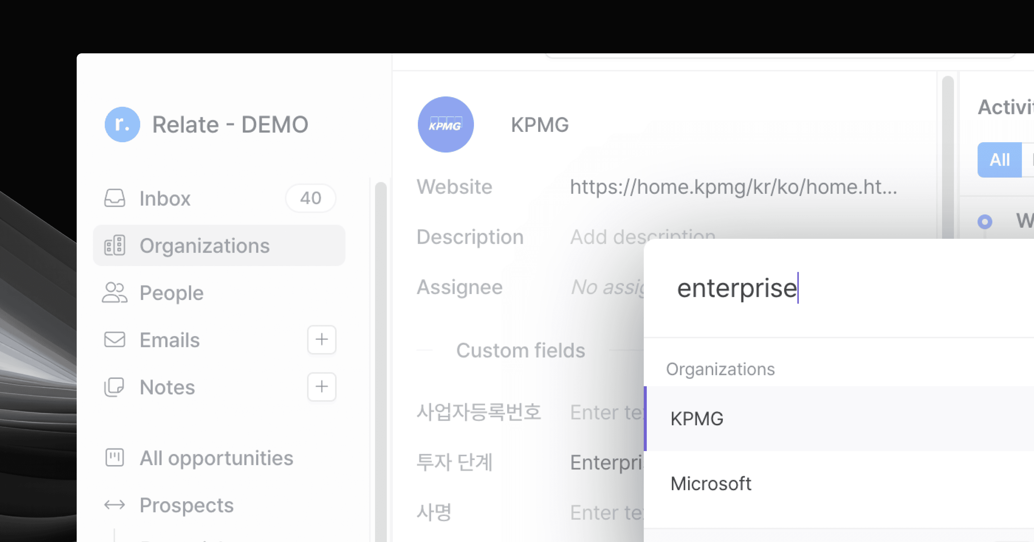이제 Cmd + K (윈도우 Ctrl + K)로 검색할 때 Text 타입의 커스텀 필드 데이터로도 검색할 수 있습니다. 가장 대표적인 사용 사례로는 주소, 지역 등의 텍스트로 저장한 데이터로 고객사를 검색하는 것입니다.