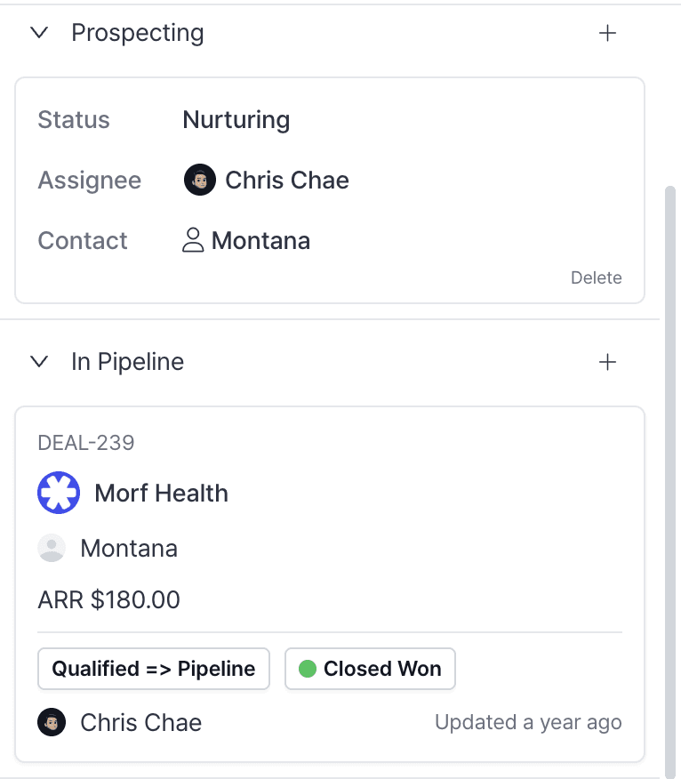 이제 Deal은 Prospecting 또는 In Pipeline 섹션에서 표시됩니다. 프로스펙팅은 잠재 고객을 적극적으로 검증하는 프로세스입니다. 잠재 고객의 자격이 확인되면 파이프라인에서 거래로 추적할 수 있도록 파이프라인 중으로 이동해야 합니다.