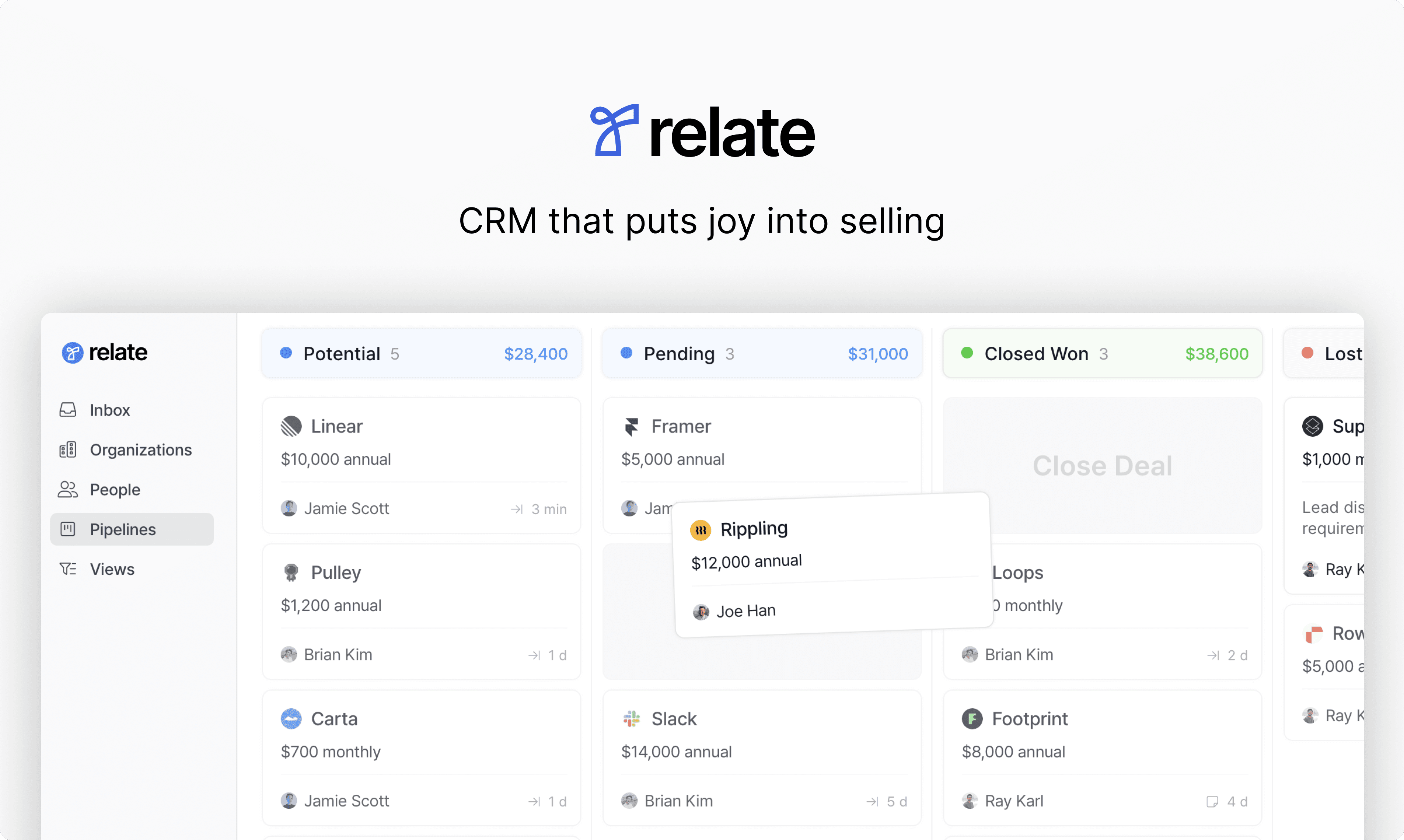 Apple의 스티브 잡스를 잠재 고객으로 보유하고 있다고 가정해 보겠습니다. Apple에 대한 프로스펙팅을 하면서, Apple의 팀 쿡도 잠재 고객으로 확보했습니다. Relate에서 이제 두 리드를 모두 추적하여 Apple을 Deal로써 파이프라인에서 추적할 수 있게 됩니다.