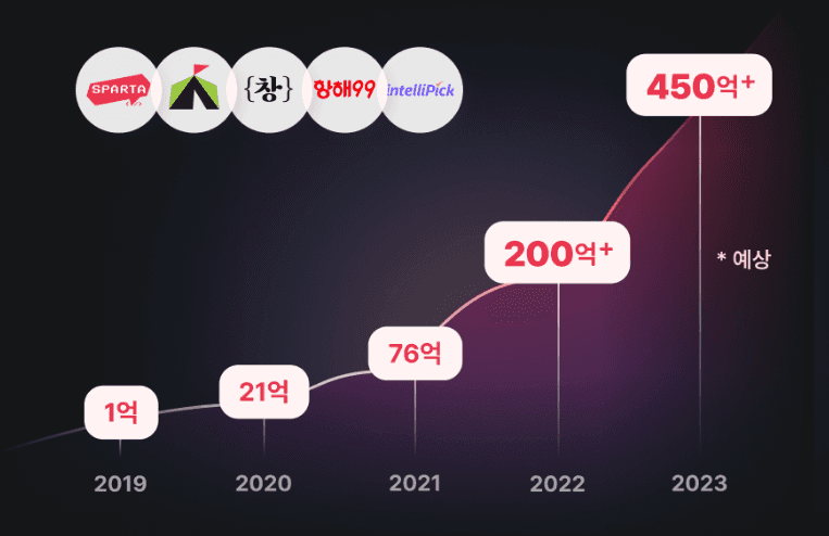 팀스파르타는 창업 이후 4년 동안 매년 연 매출이 크게 성장해서 작년 200억 돌파, 올해는 400억 이상 가능할 것으로 예상되는 매우 빠르게 성장하는 팀입니다.
